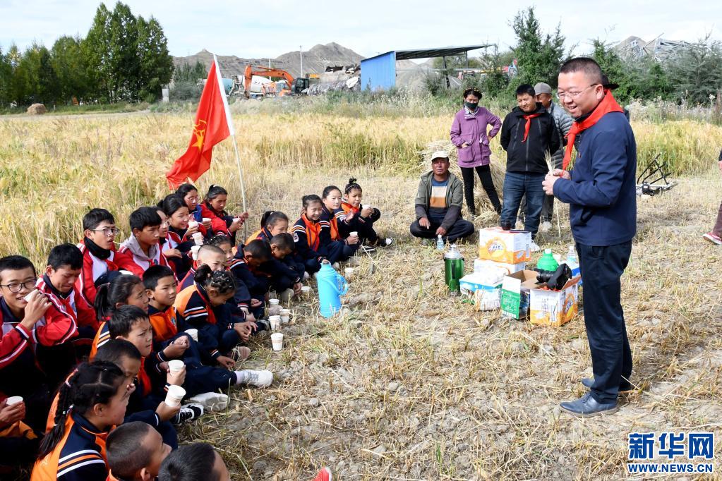 援藏教師潘杰帶著學(xué)生在青稞地里上思政課(9月14日攝)。