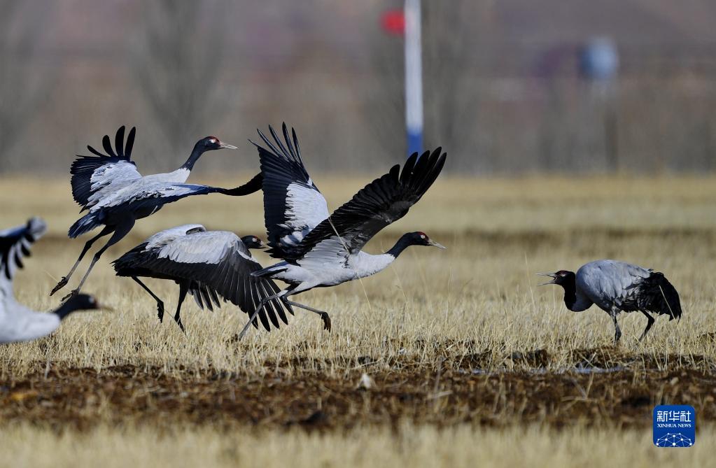 黑頸鶴在拉薩市林周縣農(nóng)田里起舞(1月8日攝)。新華社記者 張汝鋒 攝