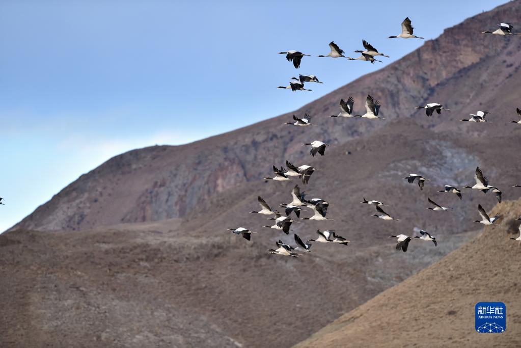 黑頸鶴在拉薩市林周縣上空飛翔(1月9日攝)。新華社記者 張汝鋒 攝