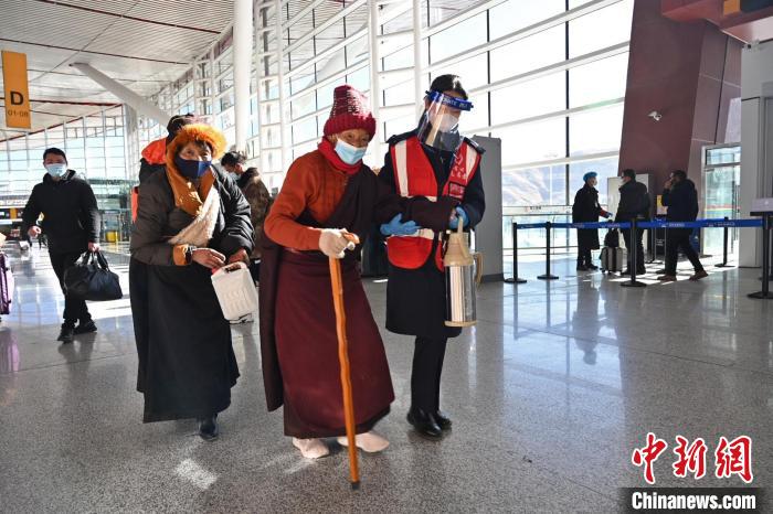 圖為在拉薩貢嘎機(jī)場(chǎng),多個(gè)臨時(shí)點(diǎn)位安排了志愿者為旅客提供服務(wù)。貢嘎來(lái)松 攝