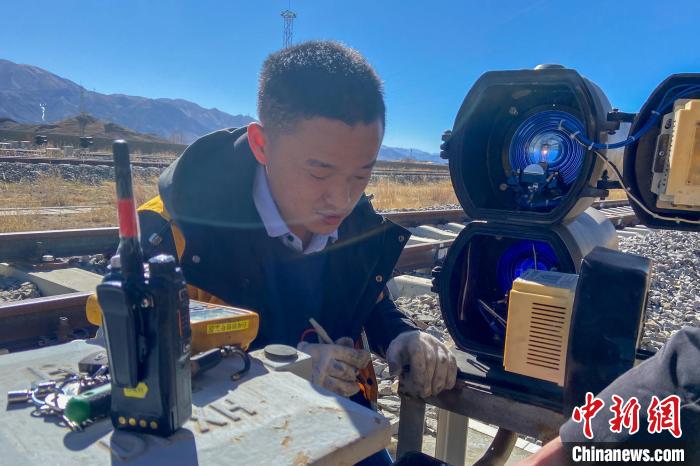 圖為劉興文在拉日鐵路測(cè)試信號(hào)機(jī)電燈電壓?!⊥鮼?lái)龍 攝