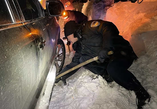 在到達(dá)現(xiàn)場(chǎng)后,救援民警立即為早已凍得瑟瑟發(fā)抖的被困人員送上了熱水和防寒大衣,并安撫了被困人員情緒。在勘察了現(xiàn)場(chǎng)的情況后,救援民警一邊用鐵鍬和雙手迅速清理車(chē)輛底盤(pán)的厚冰,一邊用牽引繩嘗試將被困車(chē)輛進(jìn)行拉出,因積雪太厚嘗試多次未能成功,隨后,協(xié)調(diào)到朗縣養(yǎng)護(hù)段一輛推土機(jī),經(jīng)過(guò)一個(gè)小時(shí)救援,被困車(chē)輛成功被拖出。被困人員救出來(lái)后,為了確保車(chē)輛人員的絕對(duì)安全,金東邊境派出所救援民警全力護(hù)送被困人員于晚上11點(diǎn)45分安全抵達(dá)單位營(yíng)區(qū),救援工作取得圓滿(mǎn)成功。
