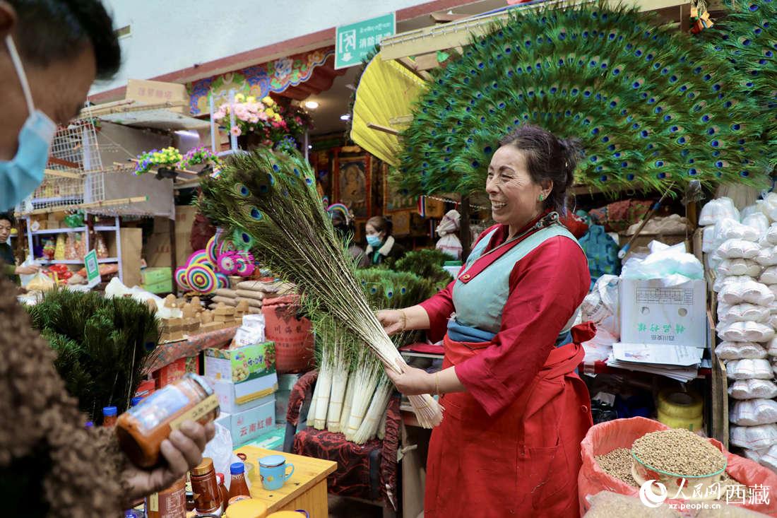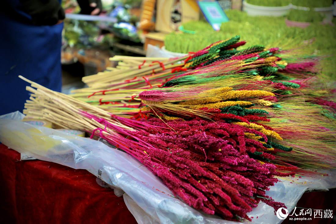 八廓商城一角售賣的 “羅薩美朵”。(每年的藏歷新年,家家戶戶的切瑪盒里都要插上 “羅薩美朵”,代表著溫馨的家庭里有著幸福的祝愿,承載著歡樂的故土上,能夠五谷豐登的期盼。)人民網(wǎng) 次仁羅布攝
