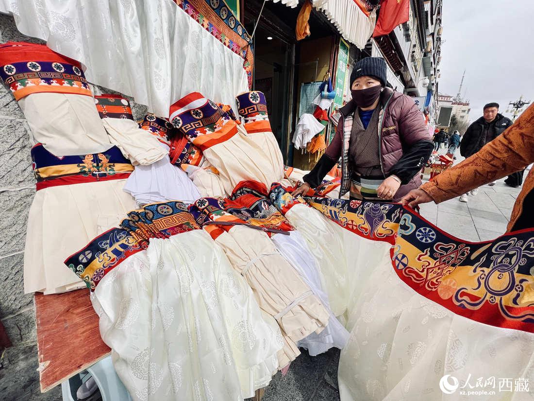 賣家按照要求為客戶裁量“香布”長度。(藏式建筑的一種特殊裝飾,懸掛在門窗上部,通常“香布”為一年一換,祈求新的一年吉祥如意。)人民網(wǎng) 次仁羅布攝