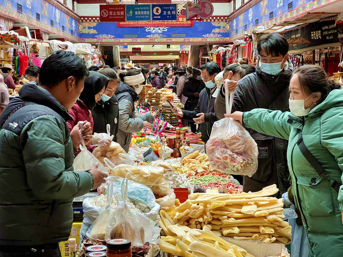 沖賽康市場、八廓商城、拉薩市區(qū)各大小超市熱鬧非凡、人頭攢動(dòng),處處都是為了采購藏歷新年年貨樂此不疲的居民群眾,耳邊盡是熟悉的吆喝聲,到處都是歡樂與喜慶。