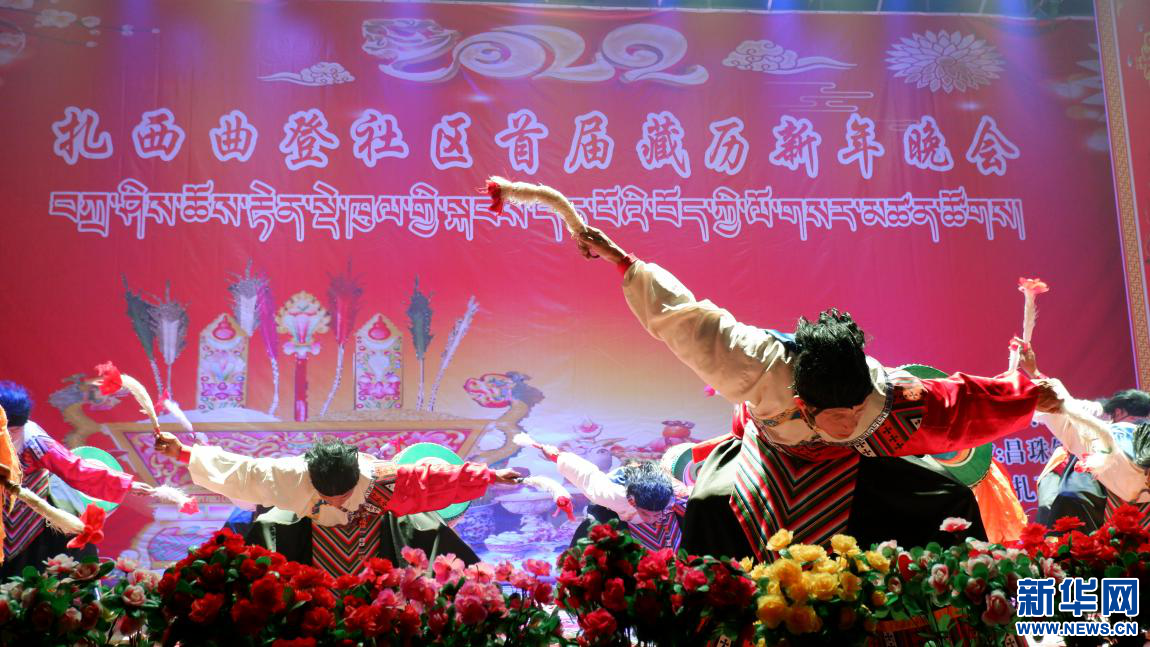 扎西曲登社區(qū)首屆藏歷新年晚會上的傳統(tǒng)舞蹈節(jié)目《雅礱卓舞》(2月26日攝)。新華網(wǎng) 殷小燕攝