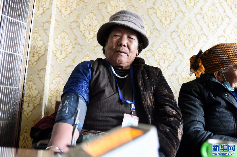 2月24日,白瑪老人在養(yǎng)老驛站測血壓。新華網(wǎng) 旦增努布 攝