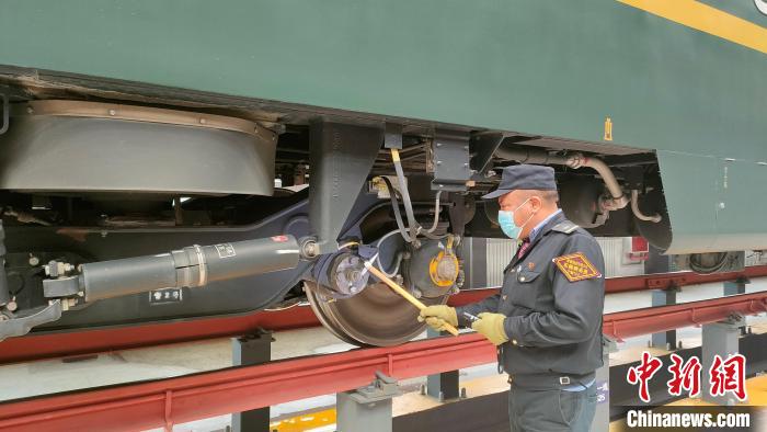 資料圖為嘎瑪達吉利用庫停時間對列車走形部進行檢查。青藏集團公司供圖