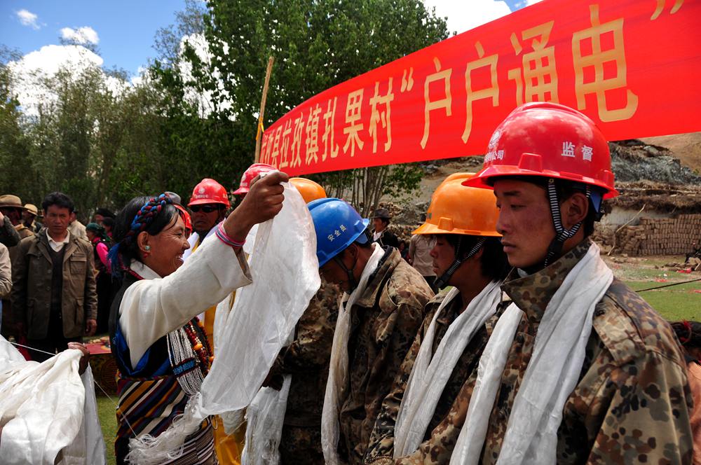 西藏日喀則市江孜縣扎果村戶戶通電工程竣工投運(yùn),農(nóng)牧民群眾向工程建設(shè)者們獻(xiàn)上哈達(dá)。圖片由國網(wǎng)西藏電力提供
