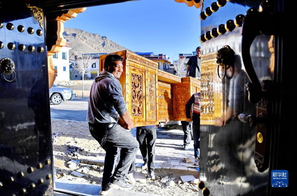 次旺堅(jiān)參(左)將家具搬進(jìn)位于湘河水庫移民新村的新家(3月27日攝)。新華社記者 張汝鋒 攝