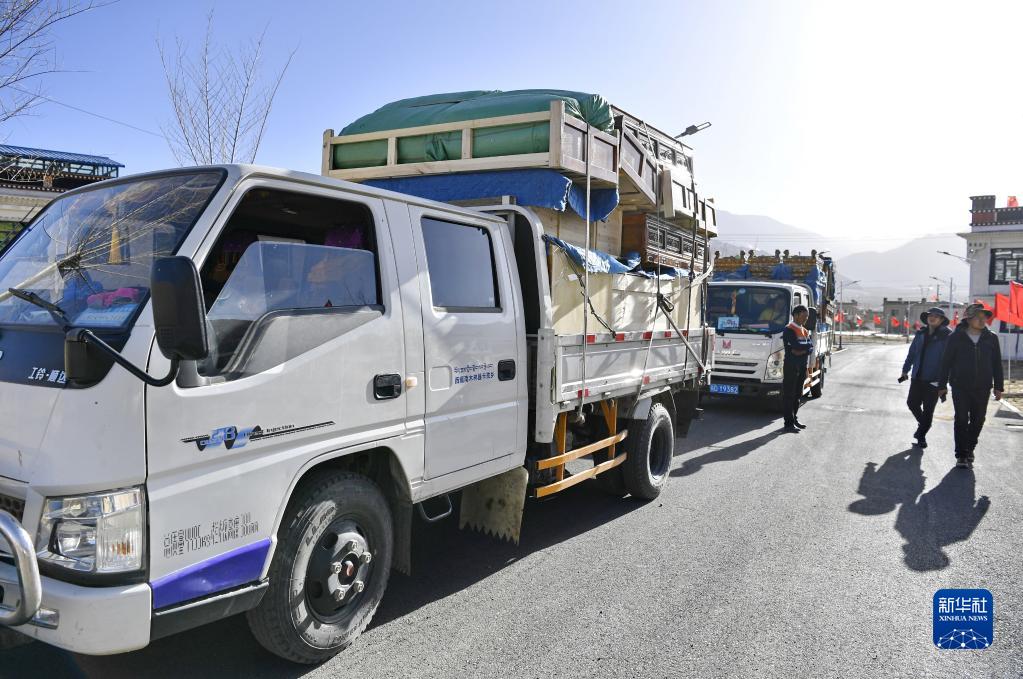 為搬遷群眾運(yùn)送家具的車輛駛?cè)胂婧铀畮煲泼裥麓澹?月27日攝)。新華社記者 張汝鋒 攝
