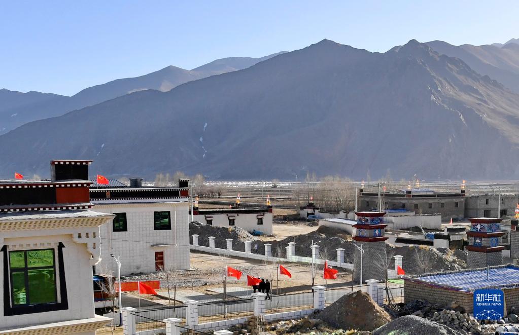 在湘河水庫移民新村,搬遷群眾羅布占堆在新居屋頂豎起五星紅旗(3月27日攝)。新華社記者 張汝鋒 攝
