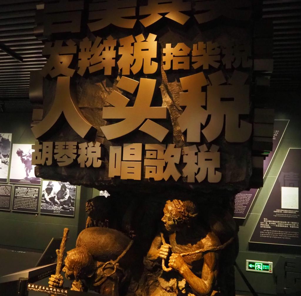 這座占地2700平方米的展館里,陳列著反映舊西藏苛捐雜稅的雕像,也陳列著舊時(shí)農(nóng)奴被囚禁虐待的慘狀。