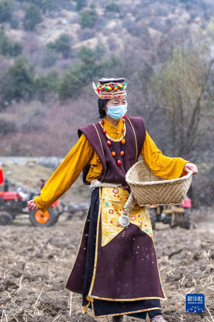 只見仁增旺姆手里端著裝滿青稞的竹筐,向田間撒下希望的種子。春耕隊伍跟隨在她的身后,肥沃的土地被犁出一道道深深的壟溝。
