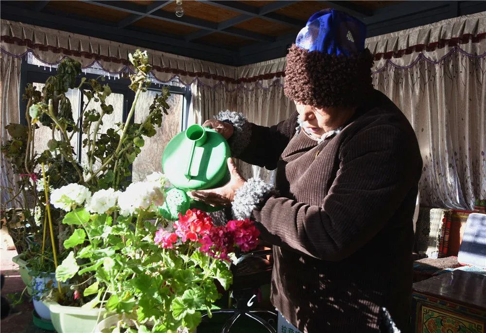 西藏洛扎縣嘎波社區(qū)扎麥村村民達(dá)瓦次仁在給陽光房里的盆栽澆水(1月19日攝)。新華社記者 陳尚才 攝