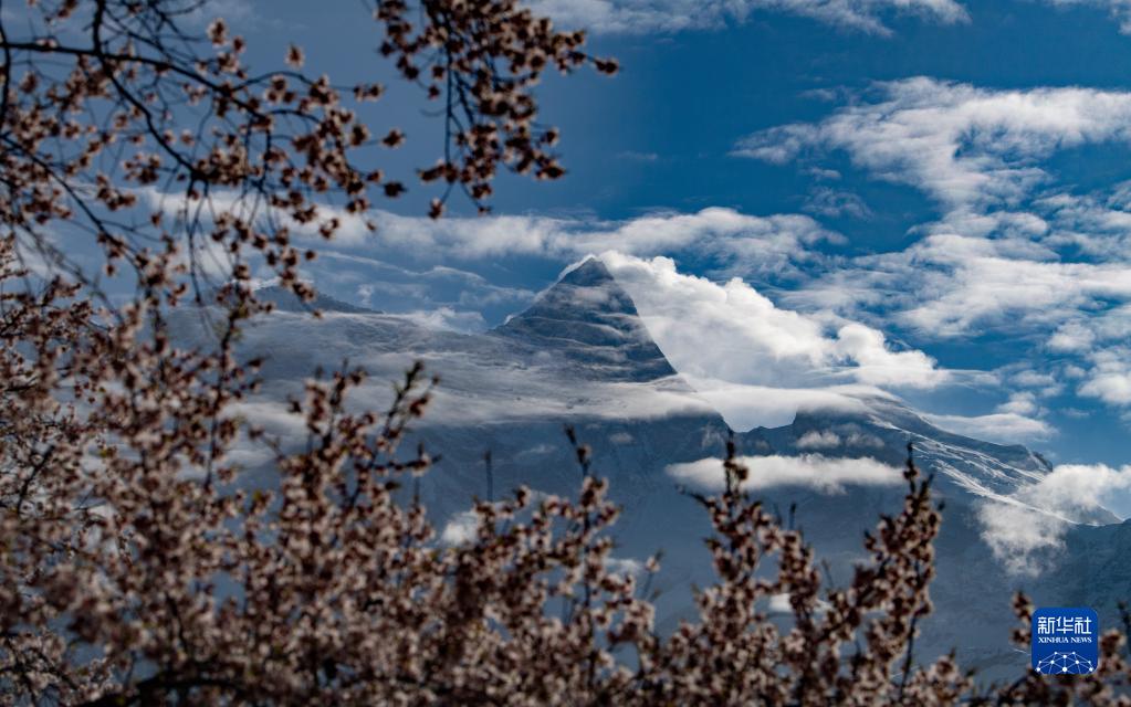 桃花掩映下的南迦巴瓦峰(4月13日攝)。新華社記者 晉美多吉 攝