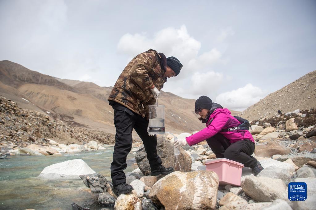 在東絨布冰川區(qū)域,科研人員進行微生物指標水樣采集(4月30日攝)。新華社記者 旦增尼瑪曲珠 攝