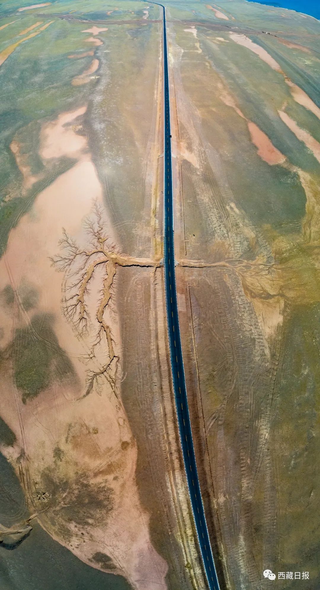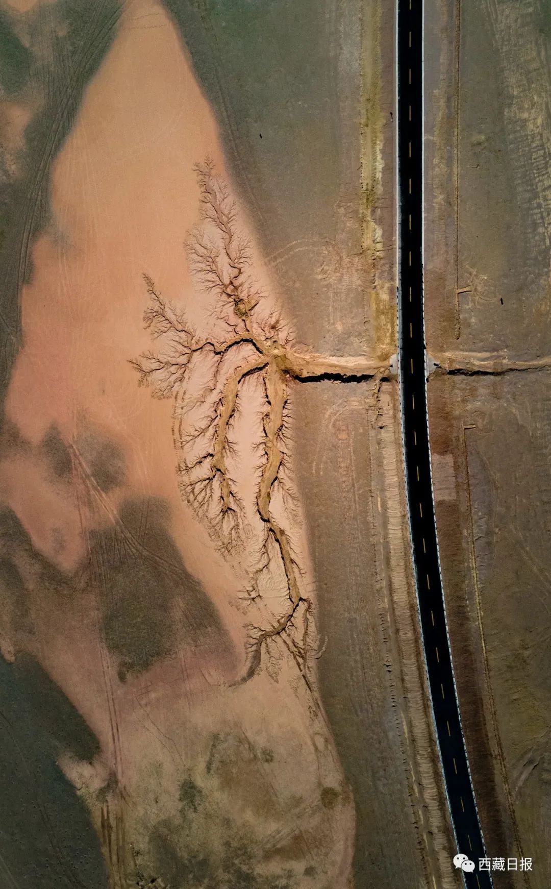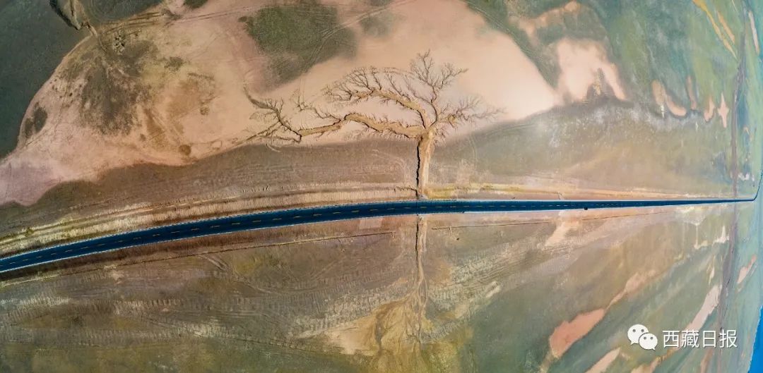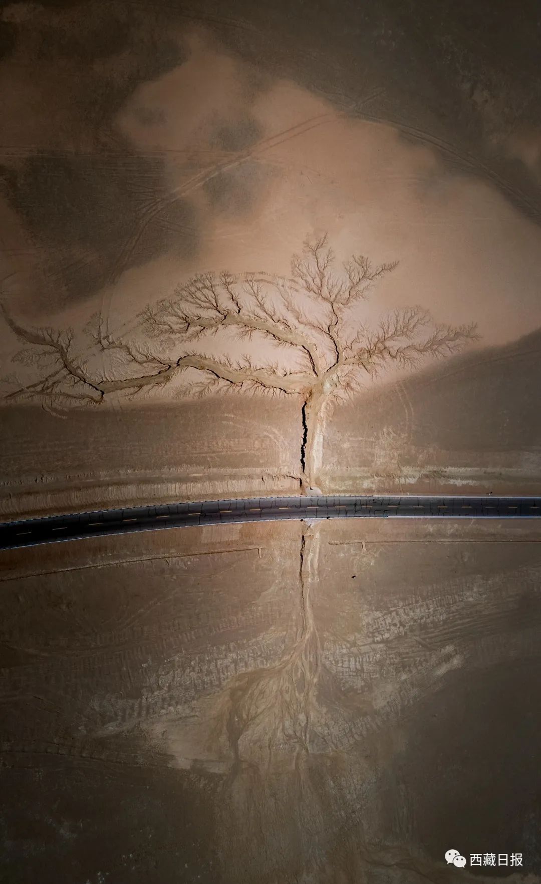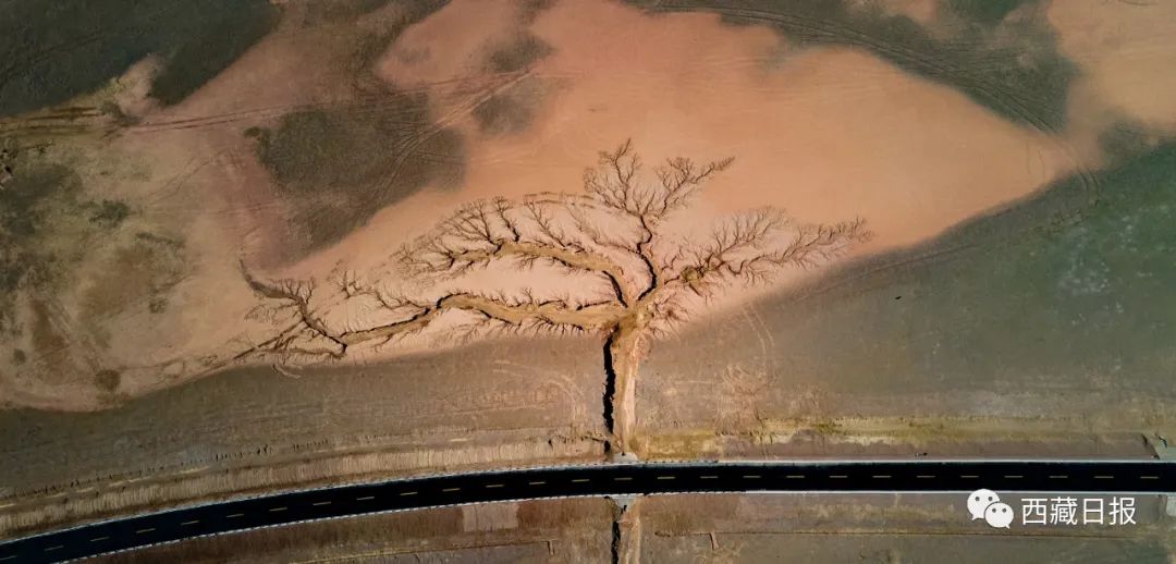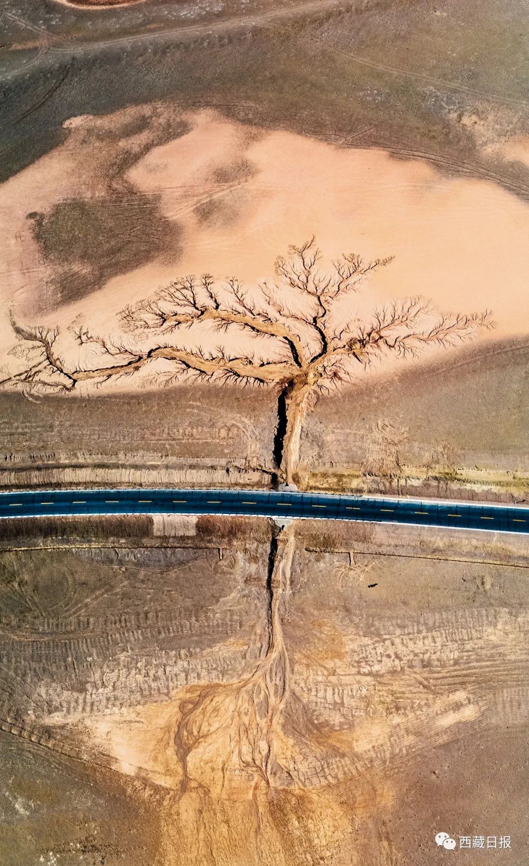 位置:“大地之樹”位于達(dá)則措南,距離尼瑪縣城30公里處,國道317 (2442)里程石墩旁邊。這棵大地之樹的樹干在國道南側(cè),樹根在國道北側(cè)。