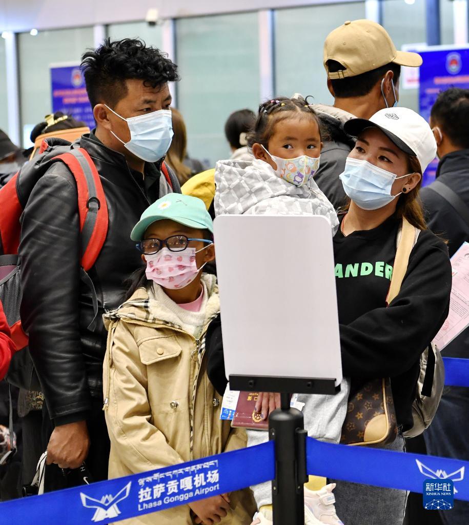 5月8日,在拉薩貢嘎機(jī)場(chǎng),家長(zhǎng)帶著患兒準(zhǔn)備安檢登機(jī)。新華社記者 張汝鋒 攝