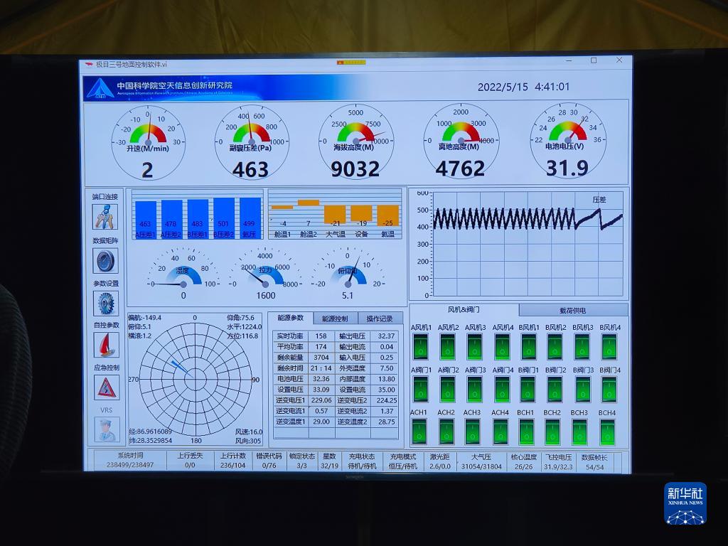 中國科學(xué)院空天信息創(chuàng)新研究院“極目一號”Ⅲ型浮空艇地面控制軟件顯示,浮空艇達到海拔9032米(5月15日 攝)。新華社記者 田金文 攝