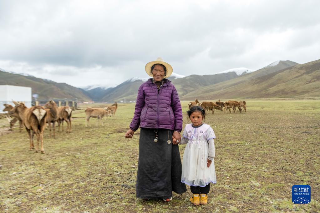 向秋拉姆和孫女在類烏齊馬鹿國家級自然保護區(qū)內(nèi)合影(5月21日攝)。新華社記者 周荻瀟 攝