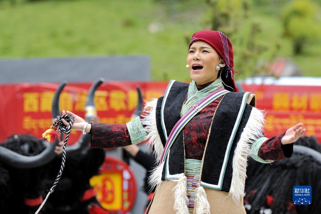 5月31日,演員在隆子縣玉麥鄉(xiāng)文化廣場表演歌舞劇《天邊格?;ā?。新華社記者 張汝鋒 攝