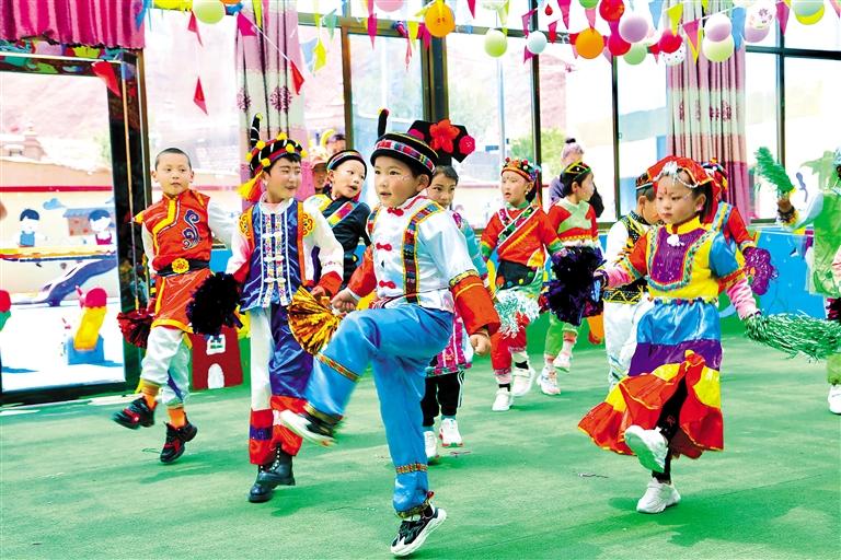 山南市瓊結(jié)縣下水村雙語幼兒園的孩子們?cè)诒硌菝褡鍒F(tuán)結(jié)進(jìn)步舞蹈《愛我中華》。通訊員 倫珠澤仁 記者 次旺 攝