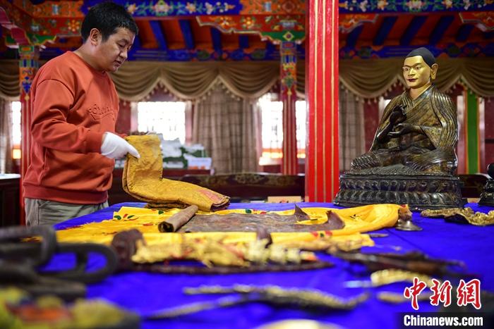 圖為捐贈(zèng)者洛桑旦增正在整理文物。 中新社記者 貢嘎來(lái)松 攝