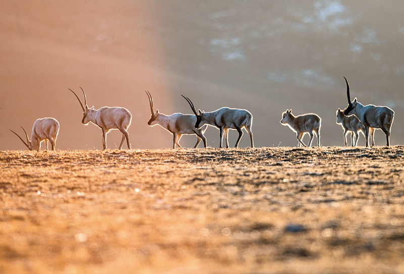 4月的傍晚,金色的霞光灑落在綿延的草原上。遠處成群的藏羚羊、藏野驢時而低頭進食,時而邁步奔跑。