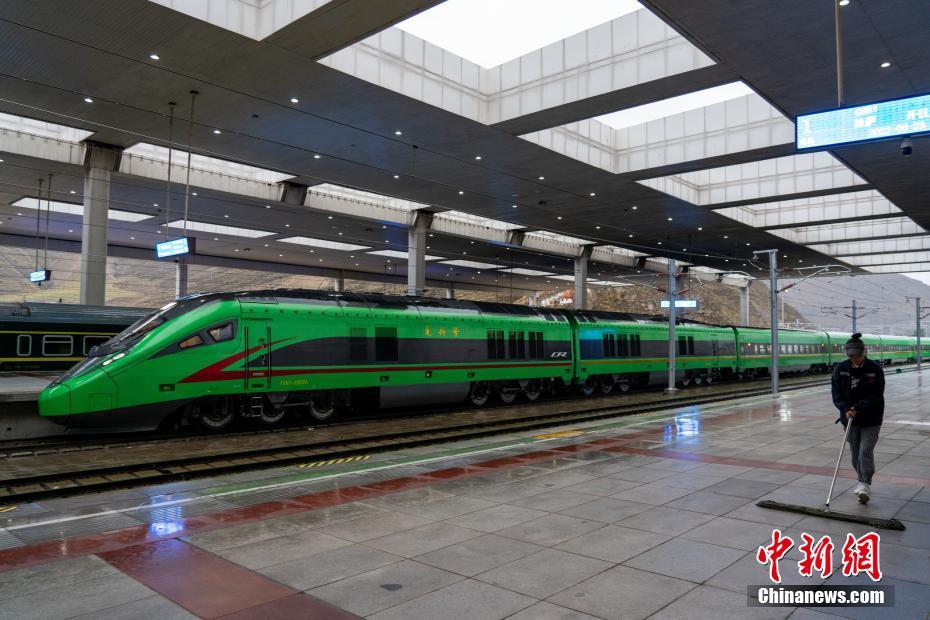 6月25日,西藏第一條電氣化鐵路——拉林鐵路開通運營滿一周年。一年來,累計運送旅客113.7萬人次、貨物4.78萬噸。圖為當(dāng)日,拉薩火車站內(nèi),復(fù)興號整裝待發(fā)。 中新社記者 江飛波 攝