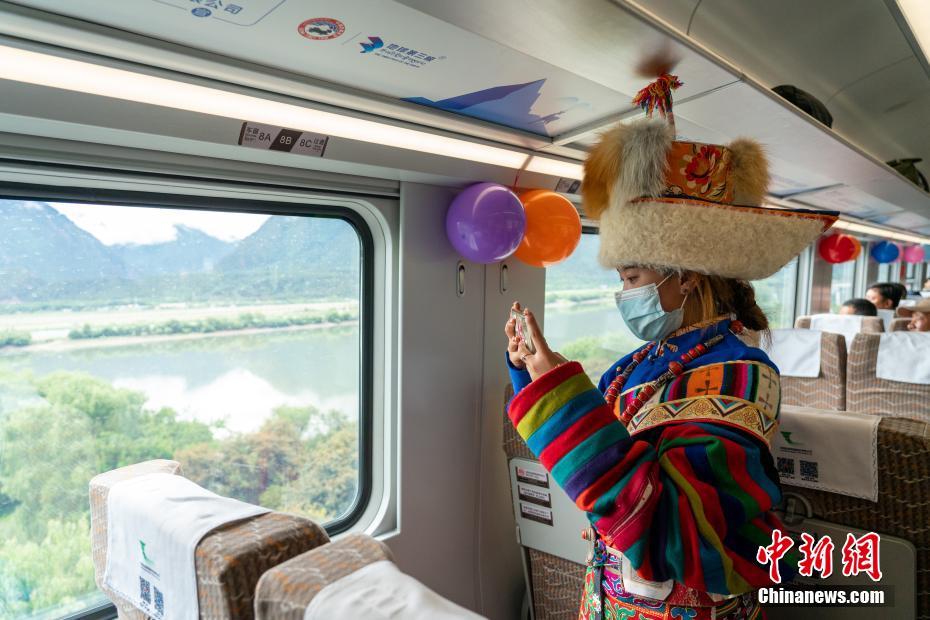 圖為當(dāng)日,西藏拉林鐵路通車一周年活動上,那曲安多牧民德吉次仁身著傳統(tǒng)盛裝首次體驗高原復(fù)興號,在進(jìn)入林芝后記錄“雪域江南”風(fēng)光。 中新社記者 江飛波 攝