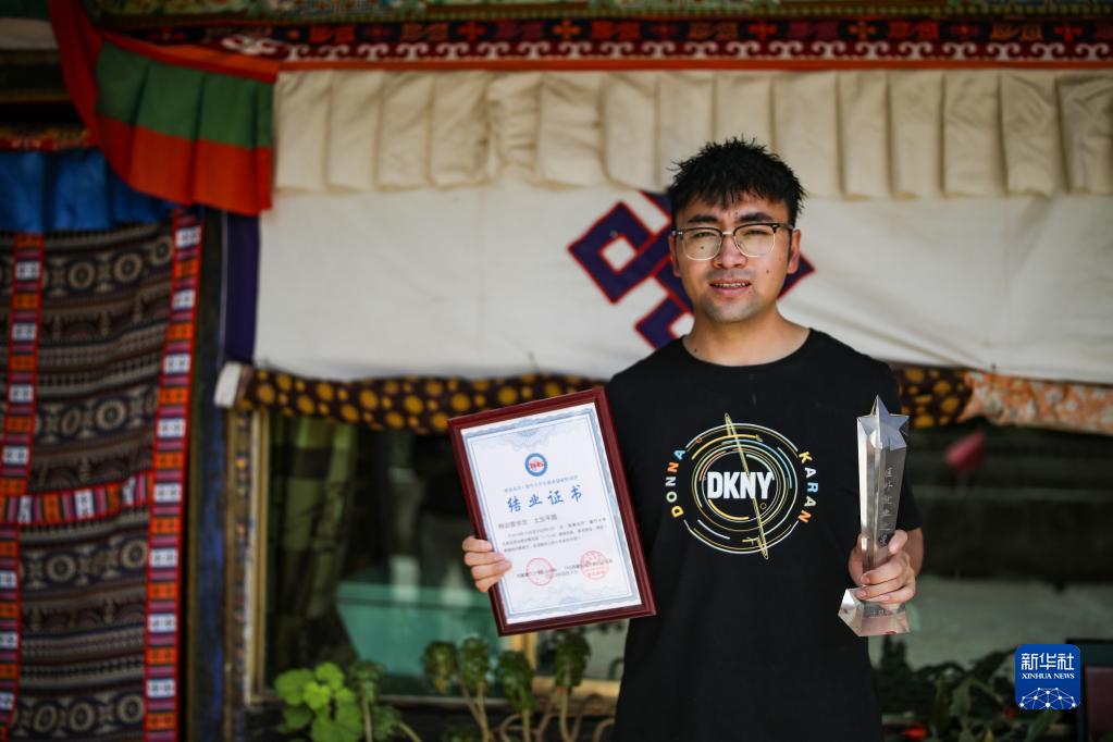 “格?;ㄩ_”大學(xué)生就業(yè)創(chuàng)業(yè)特訓(xùn)營學(xué)員、江蘇今世緣酒業(yè)股份有限公司甘青藏大區(qū)業(yè)務(wù)經(jīng)理土旦平措展示特訓(xùn)營結(jié)業(yè)證書和“區(qū)外就業(yè)之星”獎(jiǎng)杯(2022年6月23日攝)。新華社記者 姜帆 攝