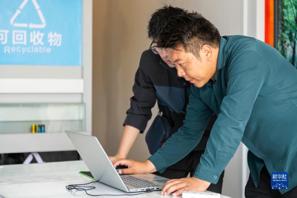 “格桑花開”大學(xué)生就業(yè)創(chuàng)業(yè)特訓(xùn)營學(xué)員、西藏墨竹工卡格?;ㄩ_大學(xué)生創(chuàng)業(yè)管理有限公司創(chuàng)辦人頓珠次仁(右)在墨竹工卡縣生活垃圾分類宣教中心講解垃圾分類常識(shí)(2022年6月23日攝)。新華社記者 周荻瀟 攝