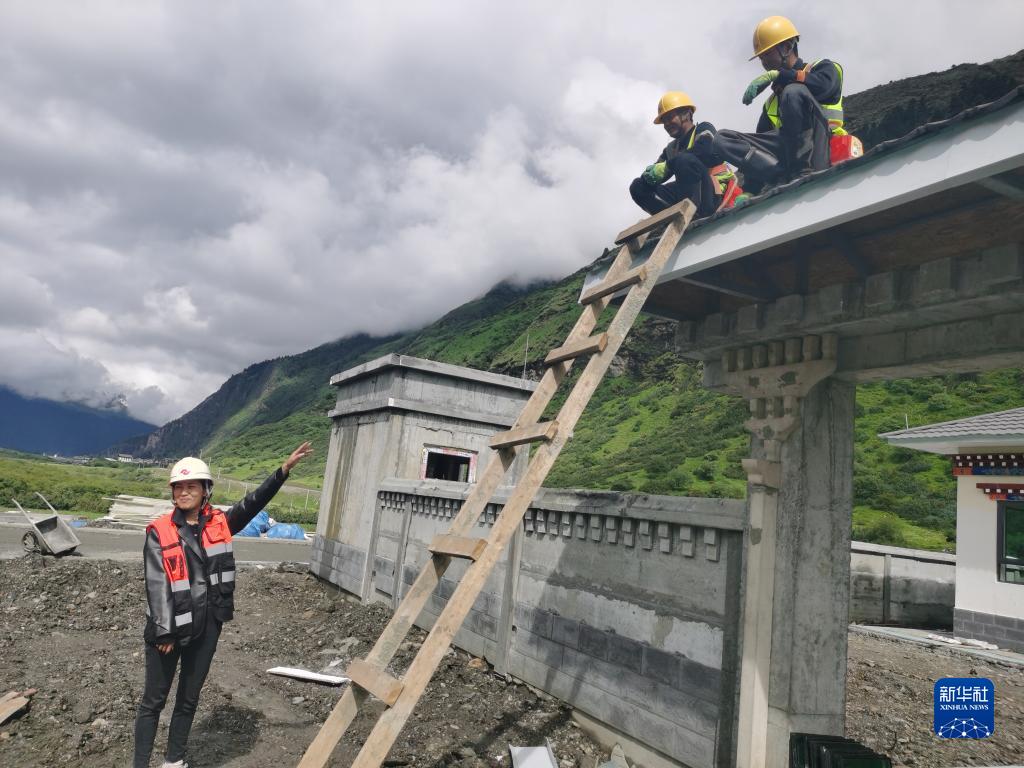 “格?;ㄩ_”大學(xué)生就業(yè)創(chuàng)業(yè)特訓(xùn)營學(xué)員、西藏藏建科技股份有限公司職員阿吉卓瑪(左)在施工現(xiàn)場(chǎng)工作(2022年6月28日攝)。