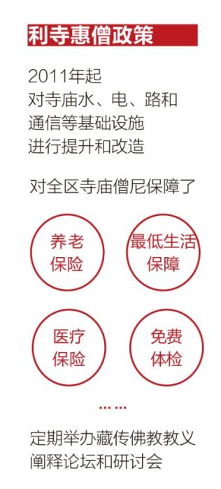 西藏出臺了一系列利寺惠僧政策,對全區(qū)寺廟僧尼保障了養(yǎng)老保險、最低生活保障、醫(yī)療保險、重大疾病醫(yī)療保險、免費體檢等。同時定期舉辦藏傳佛教教義闡釋論壇和研討會,鼓勵藏傳佛教界代表人士對藏傳佛教經(jīng)典教義作出符合國家法律法規(guī)、社會主義核心價值觀和中華優(yōu)秀傳統(tǒng)文化精神的新闡釋,藏傳佛教中國化邁出了新步伐。