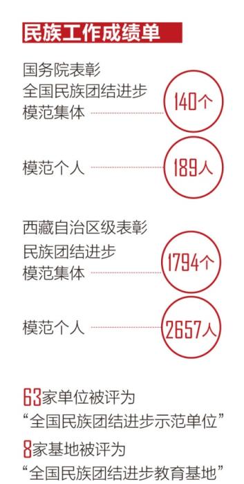 在西藏,民族團(tuán)結(jié)家庭并不是個(gè)例,有不少個(gè)人和集體也為民族團(tuán)結(jié)進(jìn)步事業(yè)作出了突出貢獻(xiàn)。目前,西藏全區(qū)榮獲國務(wù)院表彰全國民族團(tuán)結(jié)進(jìn)步模范集體140個(gè)、模范個(gè)人189人;西藏自治區(qū)級表彰民族團(tuán)結(jié)進(jìn)步模范集體1794個(gè)、模范個(gè)人2657人;63家單位被評為“全國民族團(tuán)結(jié)進(jìn)步示范單位”,8家基地被評為“全國民族團(tuán)結(jié)進(jìn)步教育基地”。拉薩、日喀則、昌都、阿里、林芝5個(gè)市地成功創(chuàng)成“全國民族團(tuán)結(jié)進(jìn)步示范地(市)”。