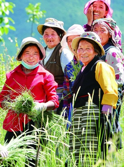 西藏加查縣共康村村民互助組在割草,為過(guò)冬的牛羊儲(chǔ)備飼料。郭紅松攝/光明圖片