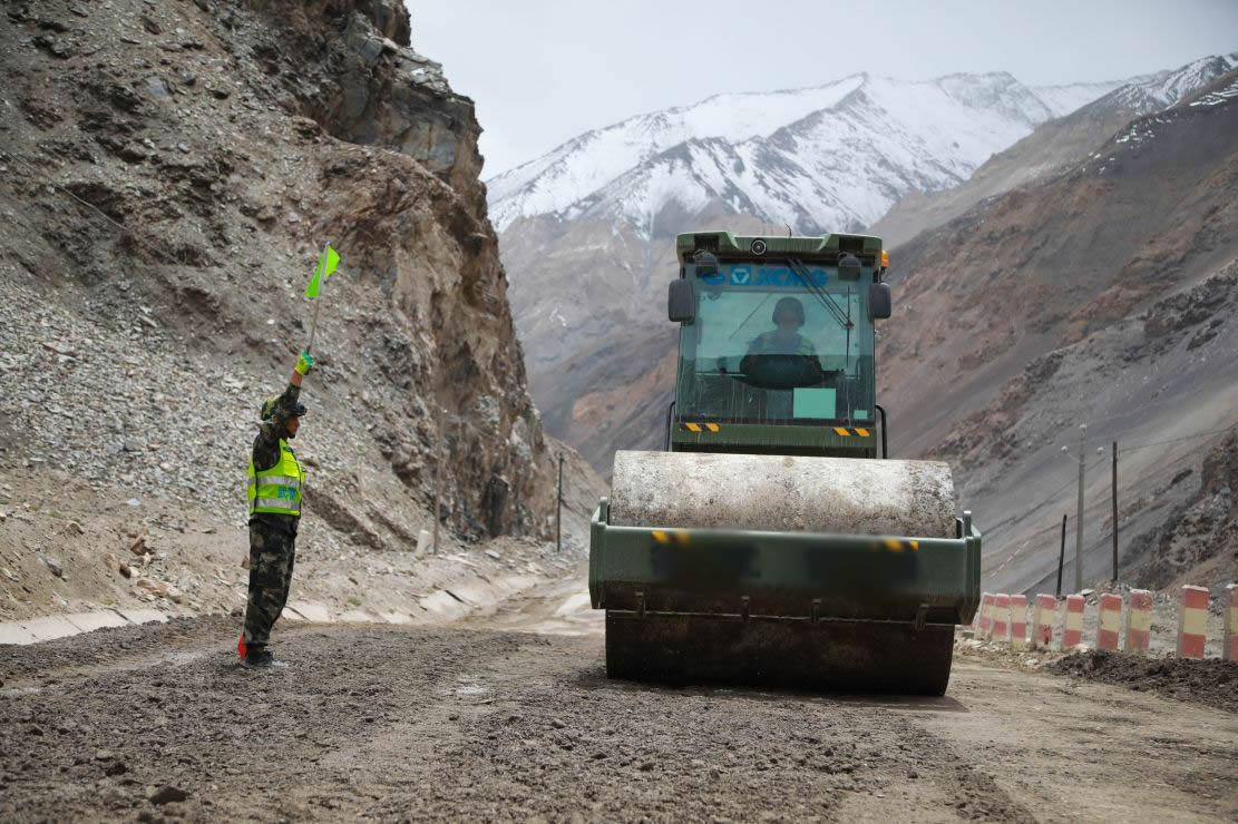 在相隔數(shù)百公里外的麻扎達(dá)坂路段,官兵們面臨的又是另一番景象,他們冒著嚴(yán)寒降雪天氣搶修沉降路基道路,現(xiàn)場(chǎng)分工后,隨后對(duì)兩端道路實(shí)施安全警戒,并做好過往群眾安撫解釋工作。指揮員高效指揮,操作手協(xié)同配合,安全員實(shí)時(shí)觀察山體情況,峽谷間機(jī)械馬達(dá)轟鳴、濃煙滾滾。2小時(shí)后,一段200多平方米的路基水穩(wěn)層全部鋪設(shè)完成,官兵們有序指揮車輛通行,司機(jī)分別鳴笛揮手向筑路兵致敬。