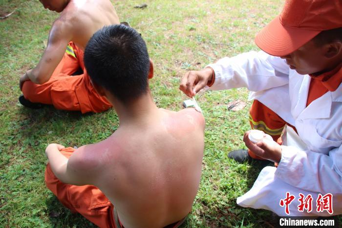 圖為為曬傷的隊員及時救治。 林芝市森林消防支隊供圖