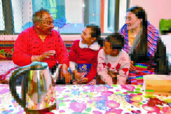 從雙湖縣多瑪鄉(xiāng)搬遷到森布日安置點(diǎn)新居的牧民索朗措加(左一)和妻子查格(右一),與孫女旦珍卓嘎(左二)和孫子歸桑桑旦一起聊天(七月十九日攝)。