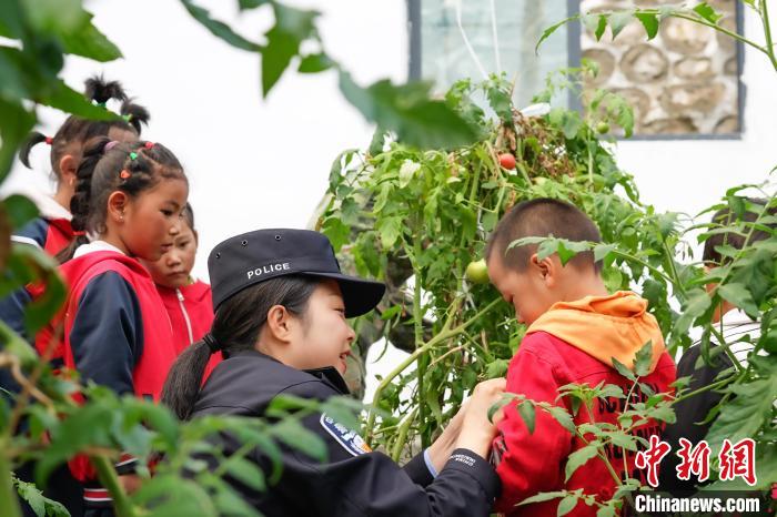 圖為亞?wèn)|出入境邊防檢查站民警楊琳帶著龐達(dá)村雙語(yǔ)幼兒園小朋友認(rèn)識(shí)成熟了的西紅柿。李錦輝 攝