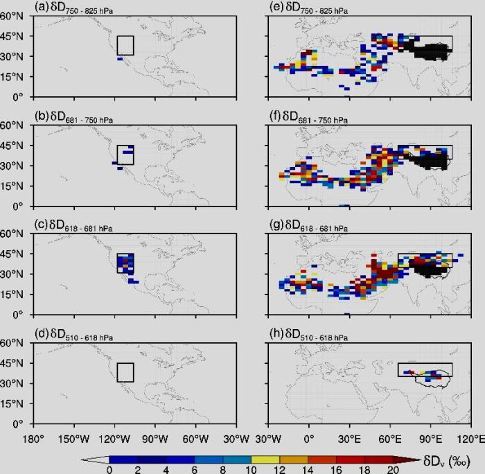 夏季美國(guó)西部和亞洲干旱區(qū)不同層水汽穩(wěn)定同位素的“反高程效應(yīng)”的空間分布格局?!≈锌圃呵嗖馗咴?供圖
