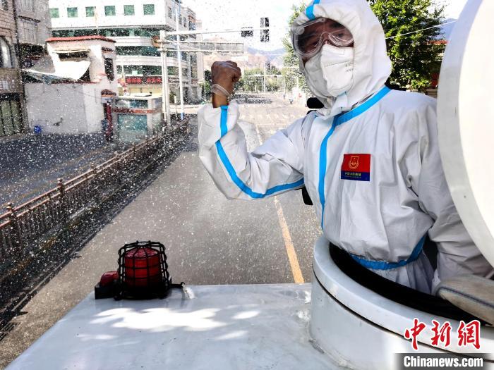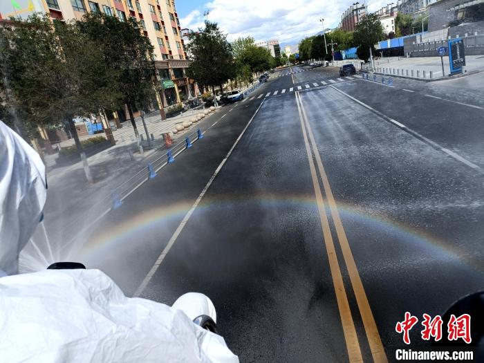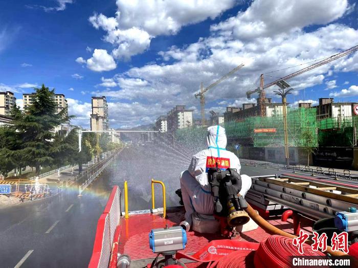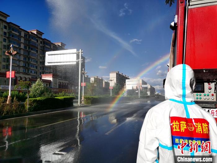 圖為拉薩消防指戰(zhàn)員在主城區(qū)街道進(jìn)行消殺。 拉薩市消防救援支隊 攝