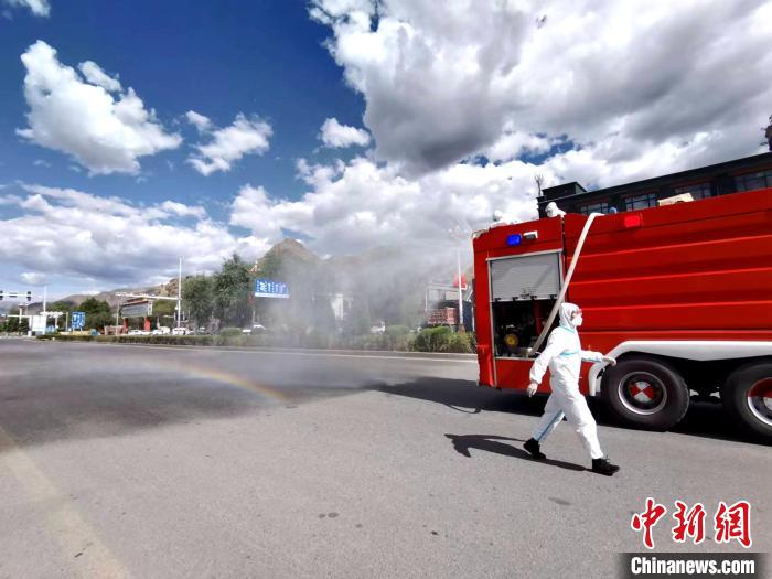 圖為拉薩消防指戰(zhàn)員在主城區(qū)街道進(jìn)行消殺?!±_市消防救援支隊 攝