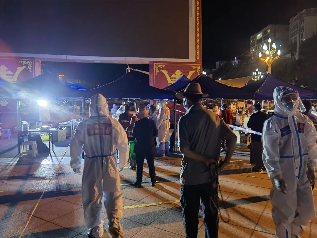 “為了您的安全,請(qǐng)保持1米以上間隔,謝謝?!蓖砩?點(diǎn)多,在茶馬廣場(chǎng),支隊(duì)三級(jí)消防士張興梁,依然堅(jiān)守在抗疫一線,維持著排隊(duì)做核酸的長(zhǎng)隊(duì)。從早上7點(diǎn)開(kāi)始,張興梁和其他消防隊(duì)員已堅(jiān)守了14個(gè)多小時(shí)?!拔鞑貢円箿夭钐卮螅滋旆雷o(hù)服里面衣服都濕透了,但是到晚上這個(gè)點(diǎn)已經(jīng)干了,正好不用換衣服了?!睆埮d梁打趣的說(shuō)到。