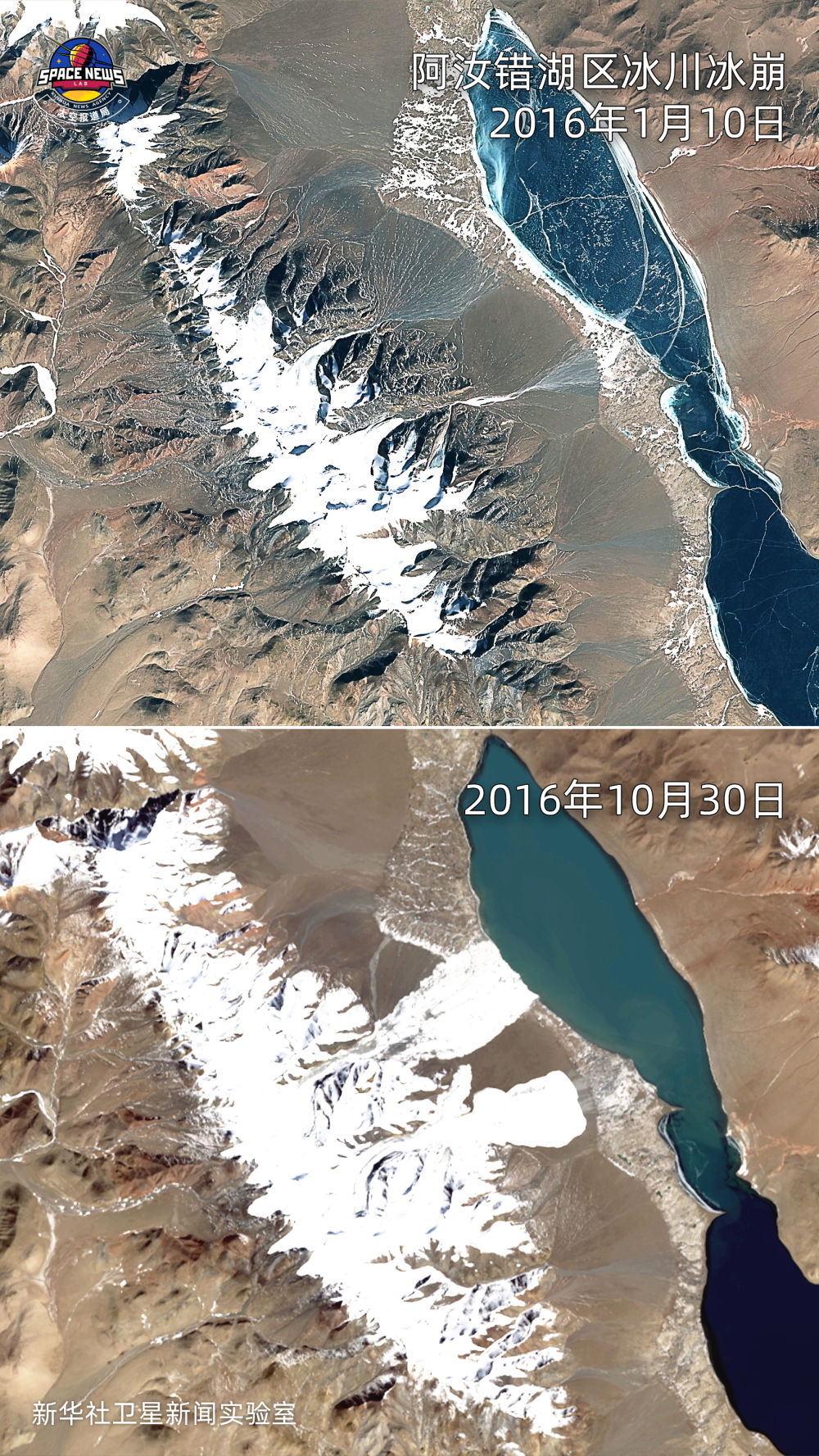 西藏阿里阿汝錯湖區(qū),2016年7月和9月先后發(fā)生兩次大型冰崩災(zāi)害,冰崩體攜帶大量碎屑物質(zhì),滑動約8公里后沖入阿汝錯,在湖岸留下兩個巨大的冰崩扇。