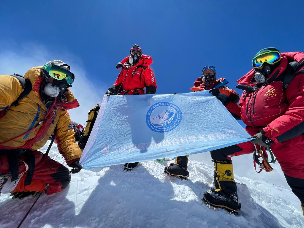 2022年5月4日,在珠穆朗瑪峰峰頂,科考隊(duì)員展示第二次青藏高原綜合科學(xué)考察研究旗幟。新華社特約記者 索朗多吉 攝