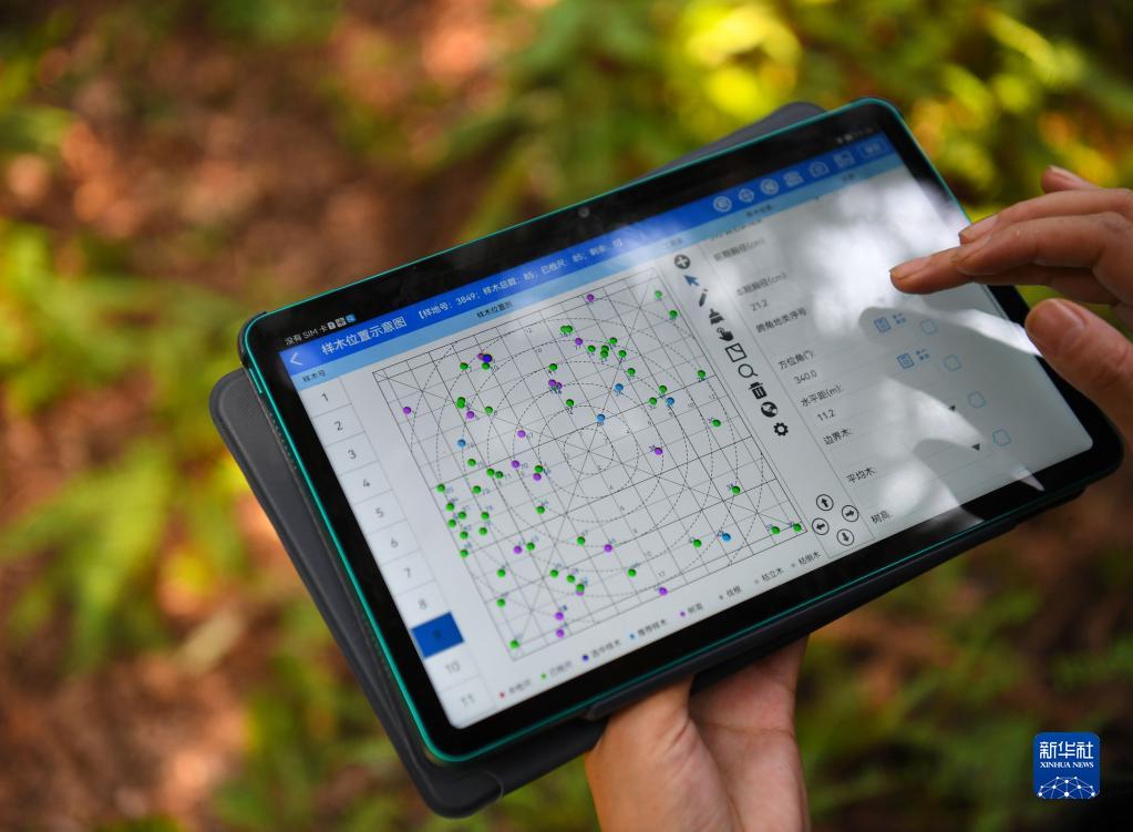 9月22日,在廣東韶關(guān)樂(lè)昌市張溪村的生態(tài)監(jiān)測(cè)樣地,白拉曲珍查看軟件數(shù)據(jù)。新華社記者 鄧華 攝