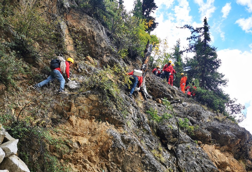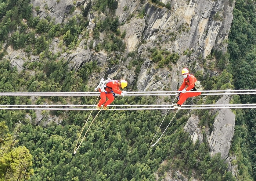 9月17日,電力施工人員正在懸崖峭壁間運(yùn)輸工器具。次仁桑布攝