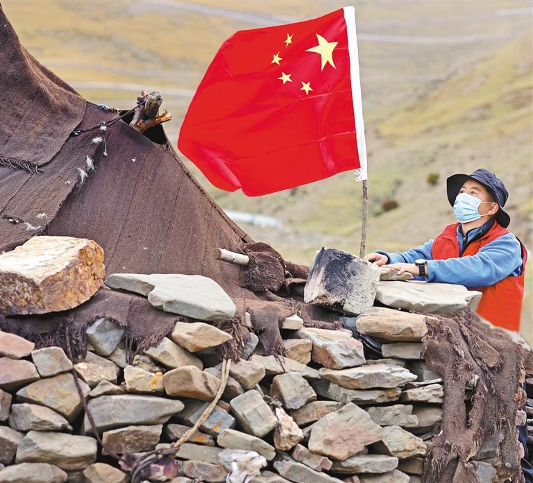 圖為山南市瓊結(jié)縣加麻鄉(xiāng)特日村駐村工作隊(duì)幫助牧民更換國旗。 通訊員 倫珠澤仁 記者 次旺 攝